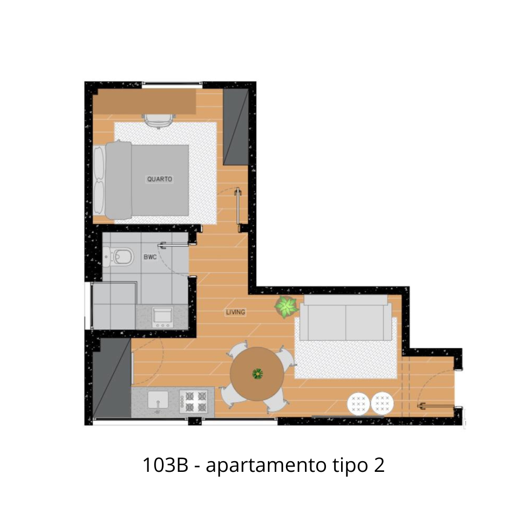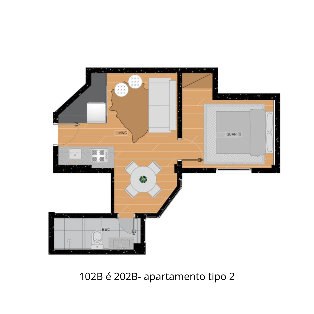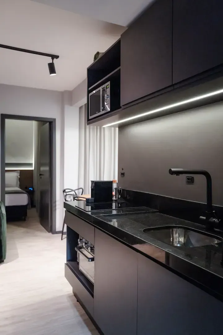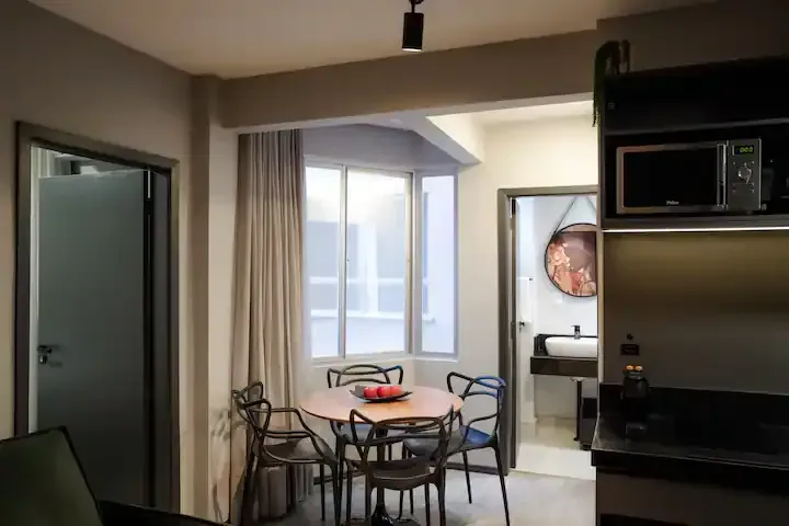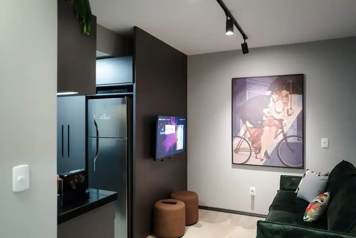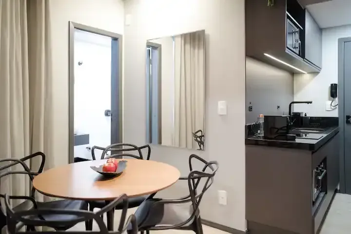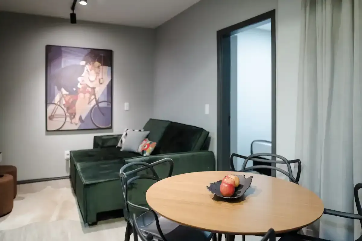 Espaço mobiliado com móveis de design, um ambiente moderno, completo e funcional. Possui um quarto com cama de casal box. Salas de estar, jantar e cozinha integradas com sofá de densidade 26. Este sofá pode ser convertido em duas Chaisse ou se transformar em uma confortável cama de casal com 2x1,15 m. Smart TV 43 polegadas. Todas as janelas possuem cortinas com blackout e película espelhada para conforto térmico e privacidade.